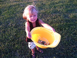 On Saturday, we attended the annual Freedom 24th of July celebration. They have dinner, a candy drop and fireworks. It was nice to mingle with a few of the folks I grew up with as well as folks from around the neighborhood as we ate ham, fabulous dutch oven potatoes and homemade salads and desserts. We watched many locals get dunked in the dunk tank and the kids enjoyed rides on the makeshift train. Then it was time for the kid's favorite part where an airplane flies by dropping candy to the kids below. In the area with the little kids, they provide plastic hard hats for them to wear so they don't suffer the wrath of being beaned on the head with hard candy. Noah and Tayton were so excited about this. They both would stand there quivering saying, "Here it comes!!! Here it comes!!!" every time the airplane would make a pass. The folks dropping candy would tear the bottom out of a paper bag filled with candy, let the candy drop, then throw the bad. Noah kept finding pieces of paper bag and bring them to me so excited that he found something. The best part was when he brought me a brown paper bag all excited because it was the remains of the bag with about 15 pieces of candy still left inside. What a find! Then Noah would run off saying he had to find Teri and be next to her. Guess he thought my strategy of finding candy wasn't efficient enough, but he was excited to bring me additional pieces of brown bag and candy to add to his existing stash. Little Tayton was so thrilled with the experience. A neighbor caught me at one point asking if she was my daughter and laughed because he said she was so excited to chase after the dropping candy that she was running her heart out and in the process was dropping candy out of her hard hat where she was storing it, as she ran. This dear man would walk behind her picking up her dropped candy and give it back to her again. Jon developed a good strategy of walking around where all the kids had left the last drop zone and getting all the candy that the other kids missed in all the excitement. He would then point it out to Noah or Tayton for them to add to their stash or if he was a little ways from them, he'd pick it up, drop it near the kids when we found them again and say "Look" pointing to the candy in the grass and let them find it and pick it up. So much fun! The kids run around wildly chasing after the airplane attempting to get as much candy as possible. Then there were fireworks at dark. Tayton is still scare and hid under her blanket, but everyone else had a fabulous time. When we arrived back at Grandma's and Grandpa's the kids were so excited to tell all the details of the evening over a shared bucket of popcorn.
